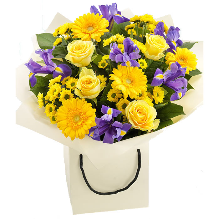 Bright, bold and beautiful. The gorgeous purple Irises in this Gift Bag Bouquet simply zing against the bright yellow Roses, Germini and Spray Chrysanthemums.